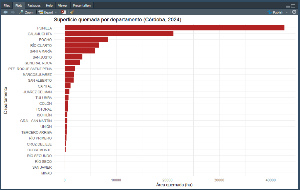 5. Gráfico simple con la librería ggplot2: además de los mapas, los datos descargados desde geoservicios pueden utilizarse para generar resúmenes e indicadores. Por ejemplo, si la capa de incendios incluye el departamento afectado como atributo, es posible calcular la superficie quemada por departamento y representarla gráficamente.