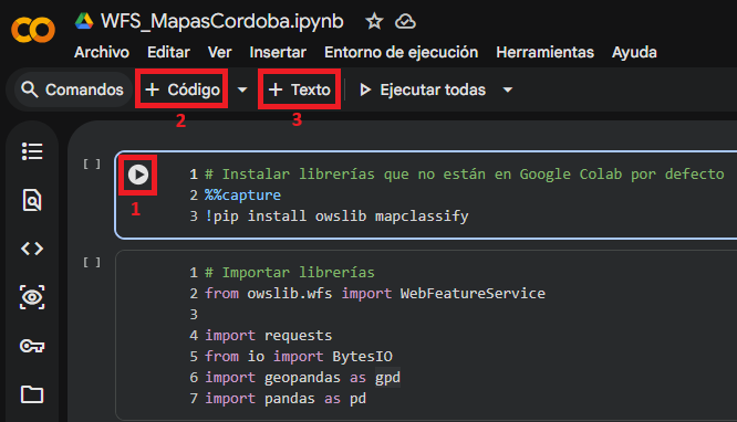 Google Colab permite ejecutar código Python en la nube mediante notebooks, que organizan el trabajo en celdas con distintas funciones: ejecutar el código de una celda (botón 1), agregar nuevas celdas de código (botón 2) e incorporar texto para documentar el proceso (botón 3).