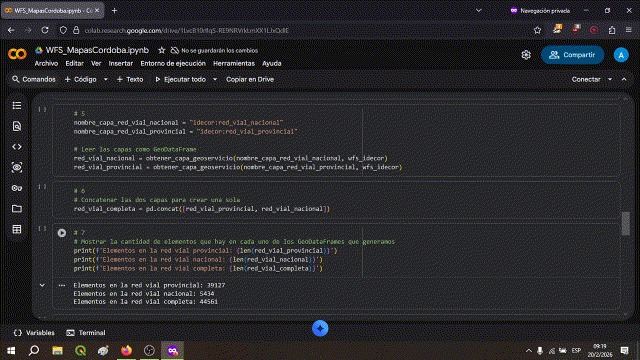 La sexta celda utiliza el método concat de pandas, que nos permite unir las capas de las redes viales nacional y provincial (similar al proceso Combinar capas vectoriales de QGIS). La nueva capa unida recibe el nombre red_vial_completa.