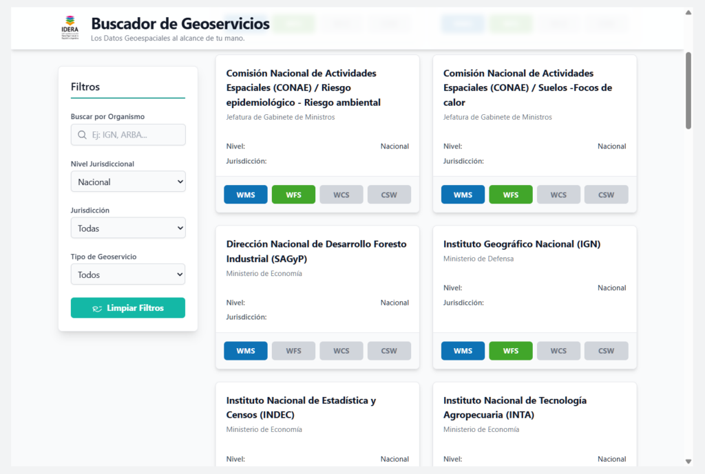 “La mejora es la unificación de los geoservicios en una sola tabla estructurada. Eso permite que los filtros sean por nivel jurisdiccional, por provincia o por tipo de geoservicio, además de incluir palabras clave que hacen la búsqueda más intuitiva”, señala.