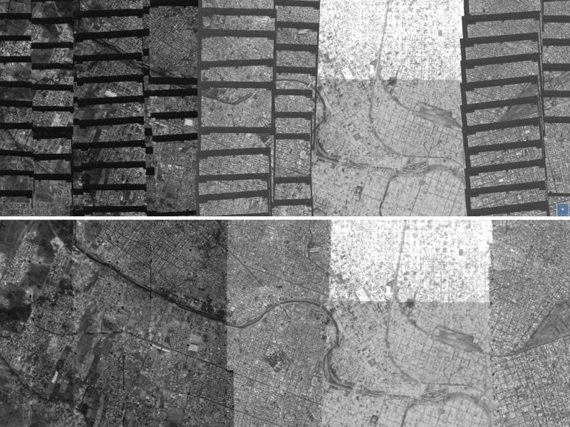 Esta mejora corresponde a las imágenes a escala 1: 5.000 de la ciudad de Córdoba, tomadas durante la década del ‘90. Como se puede observar, se recortaron las imágenes, se eliminaron los bordes y se reorganizaron los mosaicos, gracias a lo cual se logró una presentación más limpia, continua y fluida del material fotográfico.