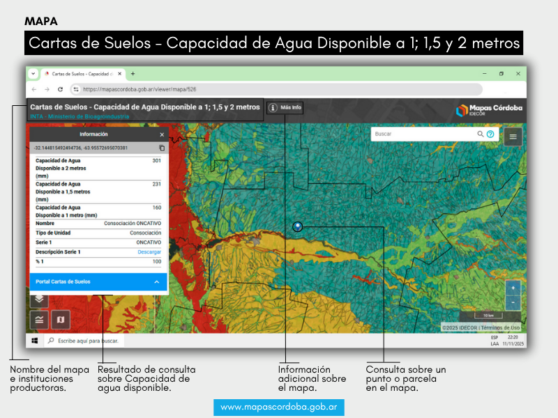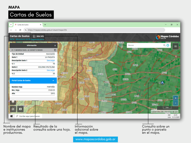 Con el apoyo de IDECOR, las cartas de suelo de Córdoba están disponibles de manera abierta en el geoportal Mapas Córdoba, sobre las que es posible realizar consultas dinámicas, descargar los datos y acceder a la descripción de unidades cartográficas y series de suelo, tanto desde cualquier dispositivo.
