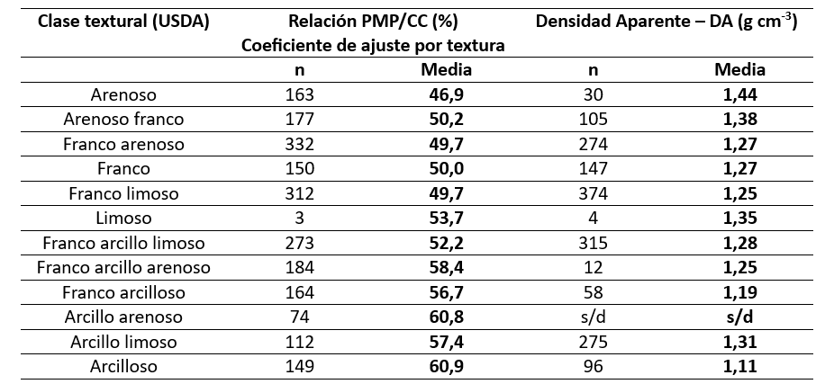 Tabla 1. Nuevos valores medios actualizados de PMP/CC (%) y Densidad Aparente – DA (g cm-3) para las distintas clases texturales (Faule y Lanfranco, INTA Manfredi).