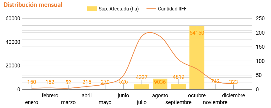 La dinámica anual muestra una fuerte concentración en el segundo semestre, con un crecimiento sostenido desde junio y un pico extraordinario en octubre, mes en el que se quemaron 54.150 hectáreas, es decir, alrededor del 72% del total anual.