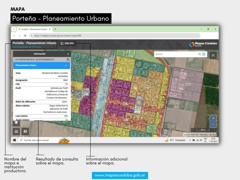 “Desde aquí preparamos y enviamos toda la información solicitada acorde a la realidad local en conocimiento, por supuesto, de la normativa vigente en Porteña y de las obras ejecutadas” comenta la funcionaria. Con dichos insumos, IDECOR desarrolló y puso en línea los mapas en formatos interoperables.