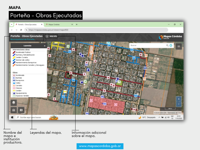 La cartografía muestra las zonas intervenidas con obras de alumbrado público, bacheo, cordón cuneta, gestión de calles, mantenimiento de banquinas, canales y desagües. Además, entre las obras que se pueden consultar, figuran equipamiento, espacios verdes, cloacas, alumbrado, calles, entre otras.