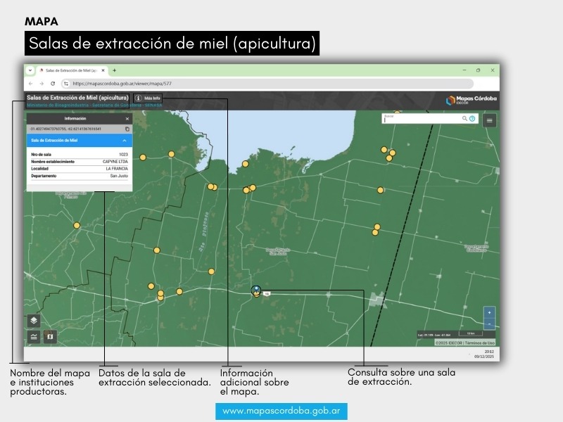 El Ministerio de Bioagroindustria de la Provincia de Córdoba, a través de la Secretaría de Ganadería junto a Senasa y el apoyo técnicoe infraestructura de IDECOR, presentan el mapa de salas de extracción de miel.