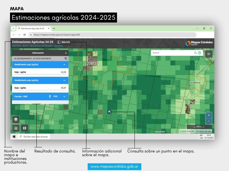 La información de la distribución espacial de los rendimientos de soja y maíz de la campaña 2024 y 2025 de toda el área cultivable de la provincia de Córdoba, ya se puede consultar en el mapa de Estimaciones agrícolas 24-25, disponible en Mapas Córdoba.